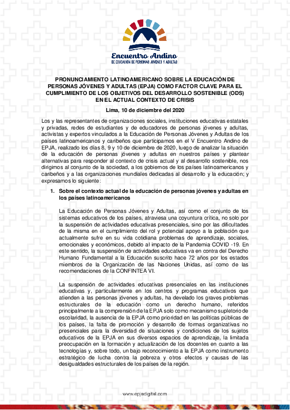 Los y las representantes de organizaciones sociales, instituciones educativas estatales y privadas, redes de estudiantes y de educadores de personas jóvenes y adultas, activistas y expertos vinculados a la Educación de Personas Jóvenes y Adultas de los países latinoamericanos y caribeños que participamos en el V Encuentro Andino deEPJA, realizado los días 8, 9 y 10 de diciembre de 2020, luego de analizar la situación de la educación de personas jóvenes y adultas en nuestros países y plantear alternativas para responder al contexto de crisis actual y al desarrollo sostenible, nos dirigimos al conjunto de la sociedad, a los gobiernos de los países latinoamericanos y caribeños y a las organizaciones mundiales dedicadas al desarrollo y la educación; y expresamos lo siguiente...