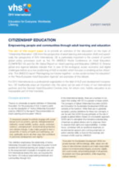 A través de sus Documentos de Expertos y de Posicionamiento, DVV International introduce temas de actualidad relacionados con la educación de adultos y la cooperación al desarrollo en el debate entre expertos y el público en general. El instituto combina así sus conocimientos especializados con la experiencia que ha acumulado en su trabajo en más de 30 países. Los Documentos de Expertos y de Posicionamiento se publican esporádicamente en alemán e inglés y están disponibles en línea.