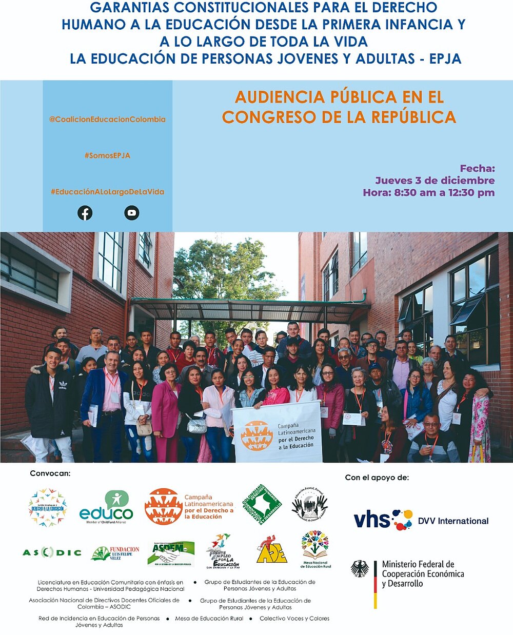 La Coalición Colombiana por el Derecho a la Educación anunció que este 3 de diciembre se realizará la audiencia pública denominada: Garantías constitucionales para el derecho humano a la educación desde la primera infancia y a lo largo de toda la vida. Educación de personas jóvenes y adultas – EPJA, la cual se realizará entre 8:30 am y 12:30 del día en el Congreso de la República de Colombia.