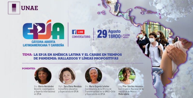 La Cátedra Abierta Latinoamericana y Caribeña EPJA de la UNAE, realiza la cordial invitación a participar de su 6to encuentro del año 2022, denominado “Conversatorio: La EPJA en América Latina y el Caribe en tiempos de pandemia: hallazgos y líneas propositivas” que se llevará a cabo el día lunes 29 de agosto de 2022, a las 18h00 – 19h30 (hora Ecuador), a través del Facebook Live de la Universidad Nacional de Educación.
