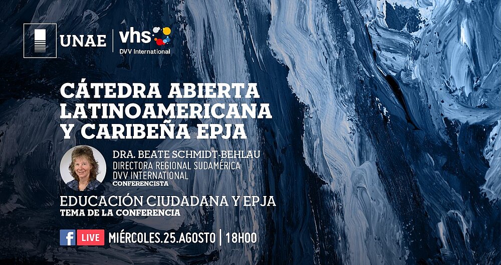 DVV International y la Universidad Nacional de Educación (UNAE) realizan la más cordial invitación a participar de la octava Conferencia Magistral denominada “Educación ciudadana y EPJA” a cargo de la Dra. Beate Schmidt-Behlau, que se llevará a cabo el día miércoles 25 de agosto de 2021, a las 18h00 (hora Ecuador, Perú). Mediante el Facebook Live de la Universidad Nacional de Educación UNAE.
