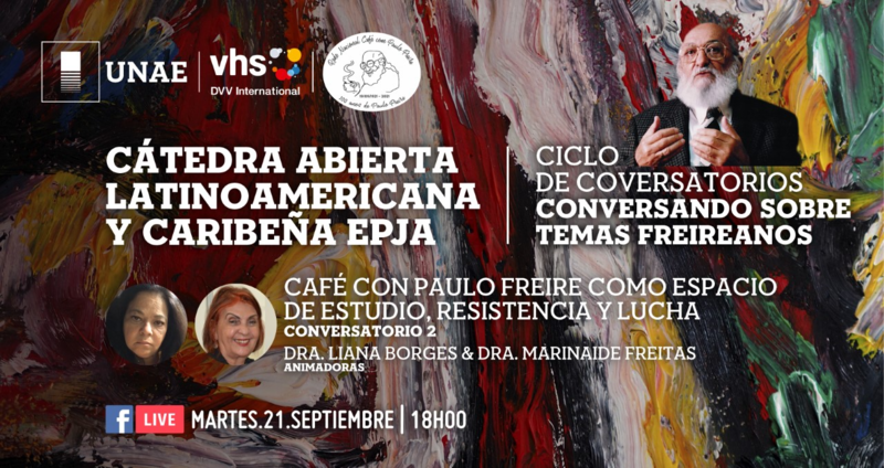 La Universidad Nacional de Educación y DVV International realizan la cordial invitación a participar del Conversatorio "Café con Paulo Freire como espacio de estudio, resistencia y lucha" a cargo de la Dra. Liana Borges y la Dra. Marinaide Freitas, que se llevará a cabo el día 21 de septiembre de 2021, a las 18h00 (hora Ecuador, Perú) 20h00 (hora Brasil, Chile), mediante el Facebook Live de la Universidad Nacional de Educación UNAE.