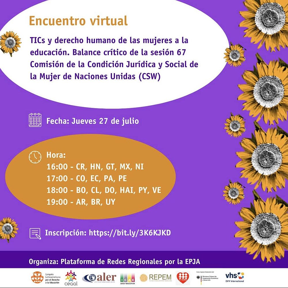 La Plataforma de Redes Regionales por la EPJA, espacio en el que participan la CLADE, el CEAAL y la REPEM, contrapartes del programa regional Sudamérica de la DVV International, invita al Encuentro Virtual "TIC y derecho humano de las mujeres a la educación. Balance crítico de la sesión 67 de la Comisión de la Condición Jurídica y Social de la Mujer, de Naciones Unidas (CSW)".