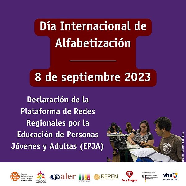 La Plataforma de Redes Regionales por la EPJA, o Plataforma EPJA, se pronunció con ocasión del Día Internacional de la Alfabetización, que se conmemora el 8 de septiembre de cada año. En su comunicación, la plataforma indica que la alfabetización debe ser prioridad en las agendas regionales y nacionales. Así también, aboga por la inclusión y el cumplimiento de los derechos de grupos vulnerables y la responsabilidad de los Estados de garantizar una educación "de calidad, gratuita, laica, de relevancia social" para todas y todos.