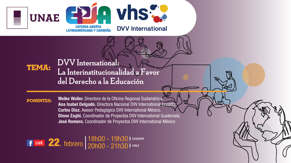 La Cátedra Abierta Latinoamericana y Caribeña EPJA, de la UNAE, y la DVV International realizarán su primer encuentro de 2024. En esta ocasión se tratará la Interinstitucionalidad a favor del Derecho a la Educación, en el marco de la experiencia de la DVV International. En esta mesa participarán por la DVV International, Meike Woller, Directora de la Oficina Regional Sudamérica, Ana Isabel Delgado, Directora en Ecuador, Carlos Díaz, Asesor Pedagógico en México, Dinno Zaghi, Cordinador de Proyectos de Guatemala, Jesé Romero, Coordinador de Proyectos en México. El conversatorio se realizará el jueves 22 de febrero de 2024, de 18:00 - 19:30 (Hora Ecuador). Y se transmitirá a través de Facebook Live, en la página de la Universidad Nacional de Educación (UNAE).