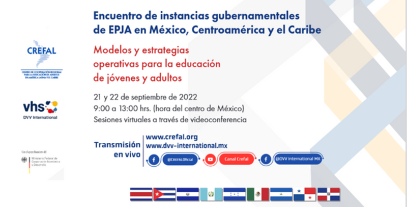 El Centro de Cooperación Regional para la Educación de Adultos en América Latina y El Caribe (CREFAL) y DVV International México desarrollarán el Encuentro de instancias gubernamentales de EPJA en México, Centroamérica y el Caribe. Este evento virtual se realizará el 21 y 22 de septiembre de 2022, de 9:00 a 13:00 (hora del centro de México). El encuentro se transmitirá en vivo a través del Facebook de CREFAL y DVV International México y a través del canal de Youtube de CREFAL.